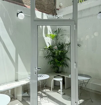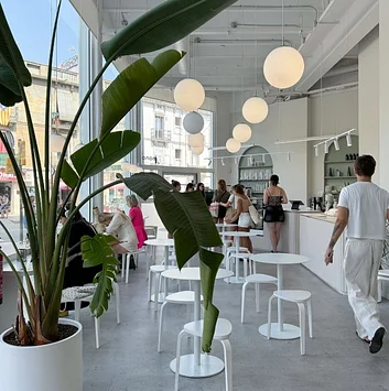 En el centro del local se ubica una gran mesa comunal de forma curva que aloja a aquellos clientes que buscan un espacio en el cual se puede trabajar en grupo . En el fondo, un banco curvo de material con pequeñas mesitas de hierro se relaciona con el patio exterior para aquellos usuarios que buscan un sitio más personal y acogedor.
